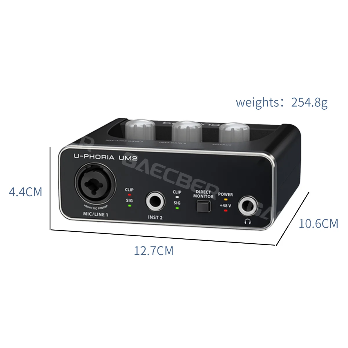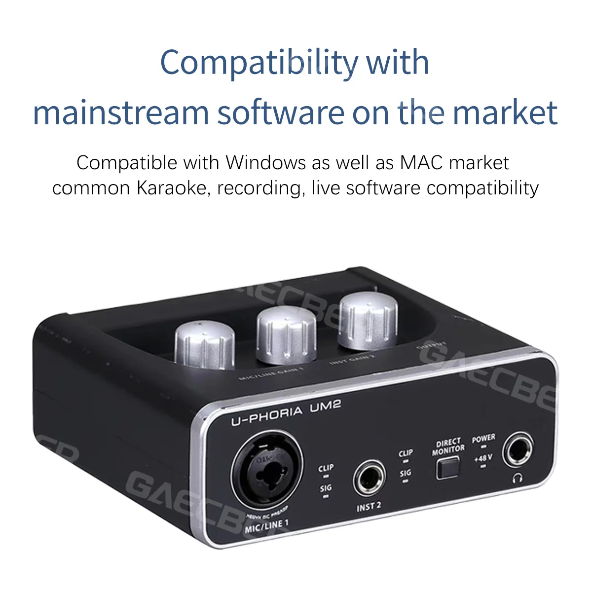 Удивительный ультракомпактный USB-аудиоинтерфейс UM2 2 x 2, 48 кГц позволяет записывать идеальные вокальные или инструментальные треки прямо на компьютер благодаря микрофонному предусилителю XENYX с фантомным питанием +48 вольт для конденсаторных микрофонов и студийному преобразователю. Если вы автор-исполнитель, продюсер на выезде или просто нуждаетесь в надежном интерфейсе для работы с бэк-треками на концерте, сверхнадежный U-PHORIA UM2 поможет вам сиять в цифровой сфере.