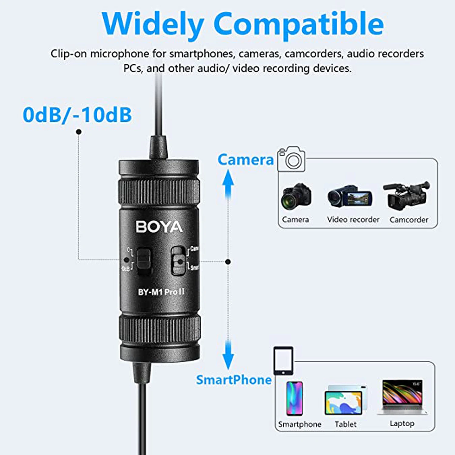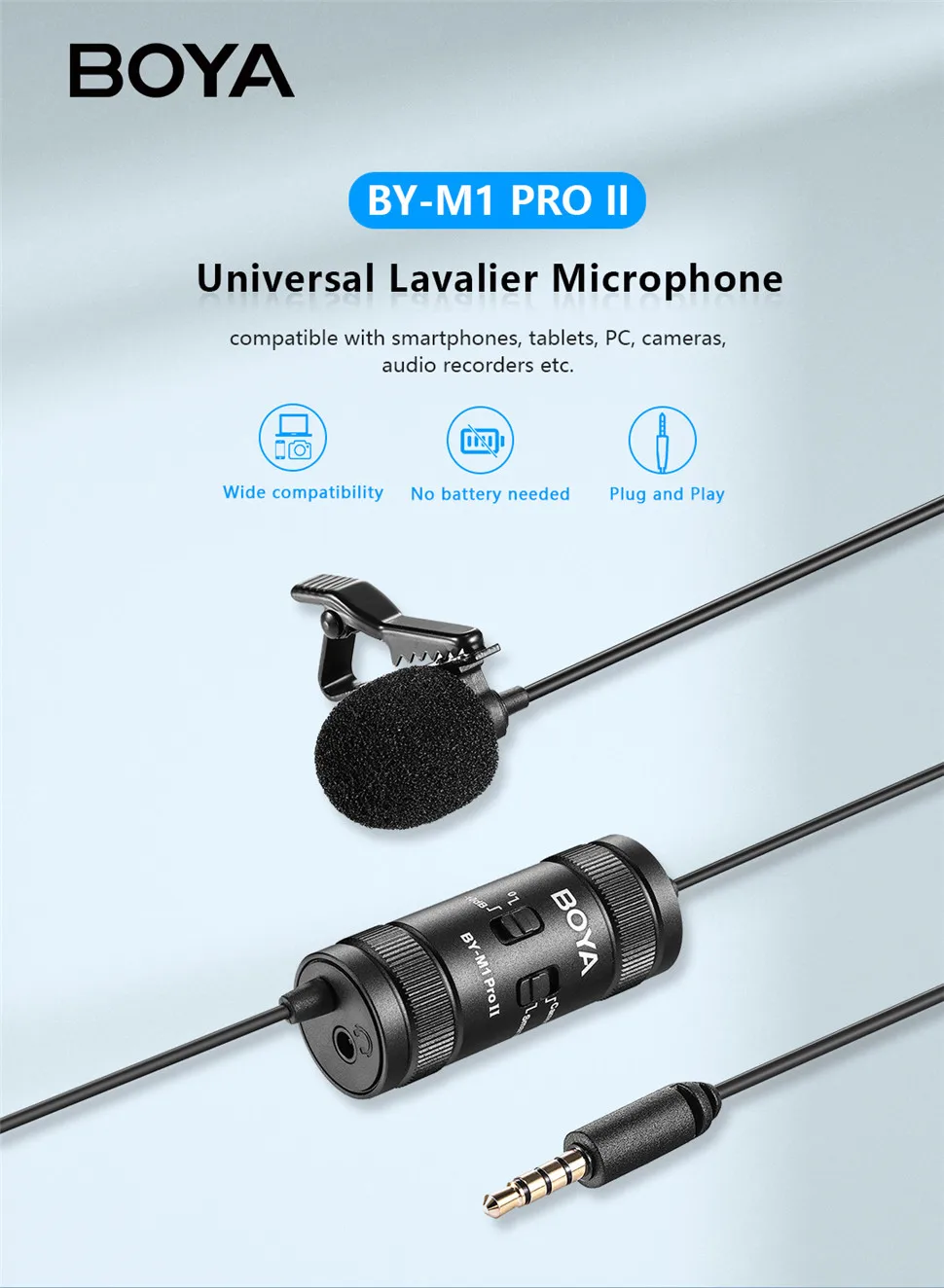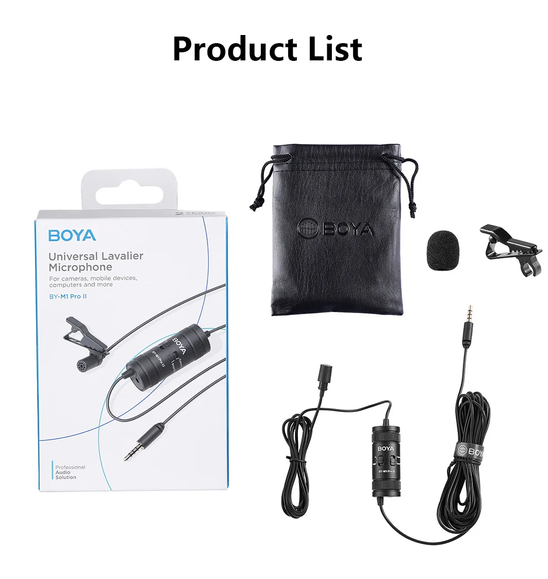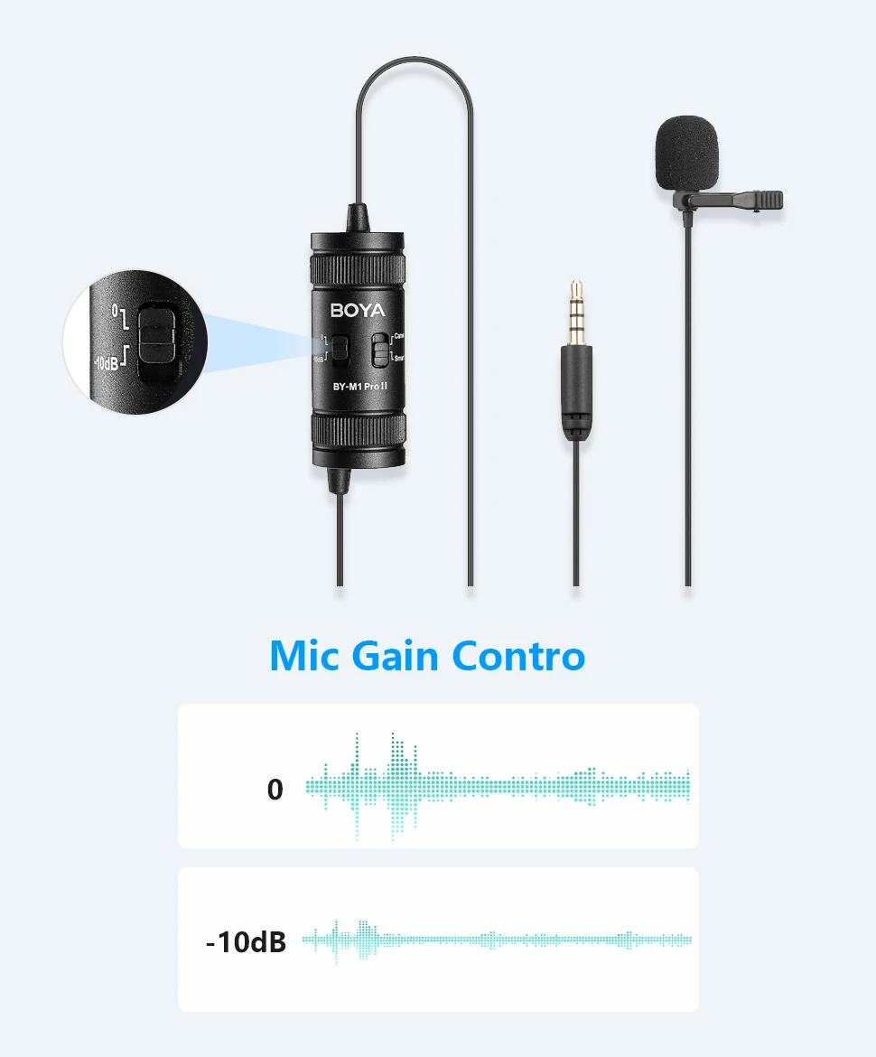 BY-M1 Pro Il — универсальный петличный микрофон с всенаправленной микрофонной капсулой, обеспечивающий 360-градусный захват звука, совместимый со смартфонами, планшетами, ПК, камерами, диктофонами и т. д. BY-M1 Pro ll имеет аудиокабель длиной 6 м (19,7 фута), что увеличивает пространство для движения и удобство использования. Благодаря настройке усиления микрофона -10 дБ он быстро понижает уровень, когда звук объекта съемки очень громкий и находится близко к микрофону, обеспечивая всегда четкую запись. Благодаря разъему для наушников 3,5 мм в нижней части пользователи могут контролировать звук в режиме смартфона. Он подходит для интервью, прямых трансляций, выступлений и многого другого.