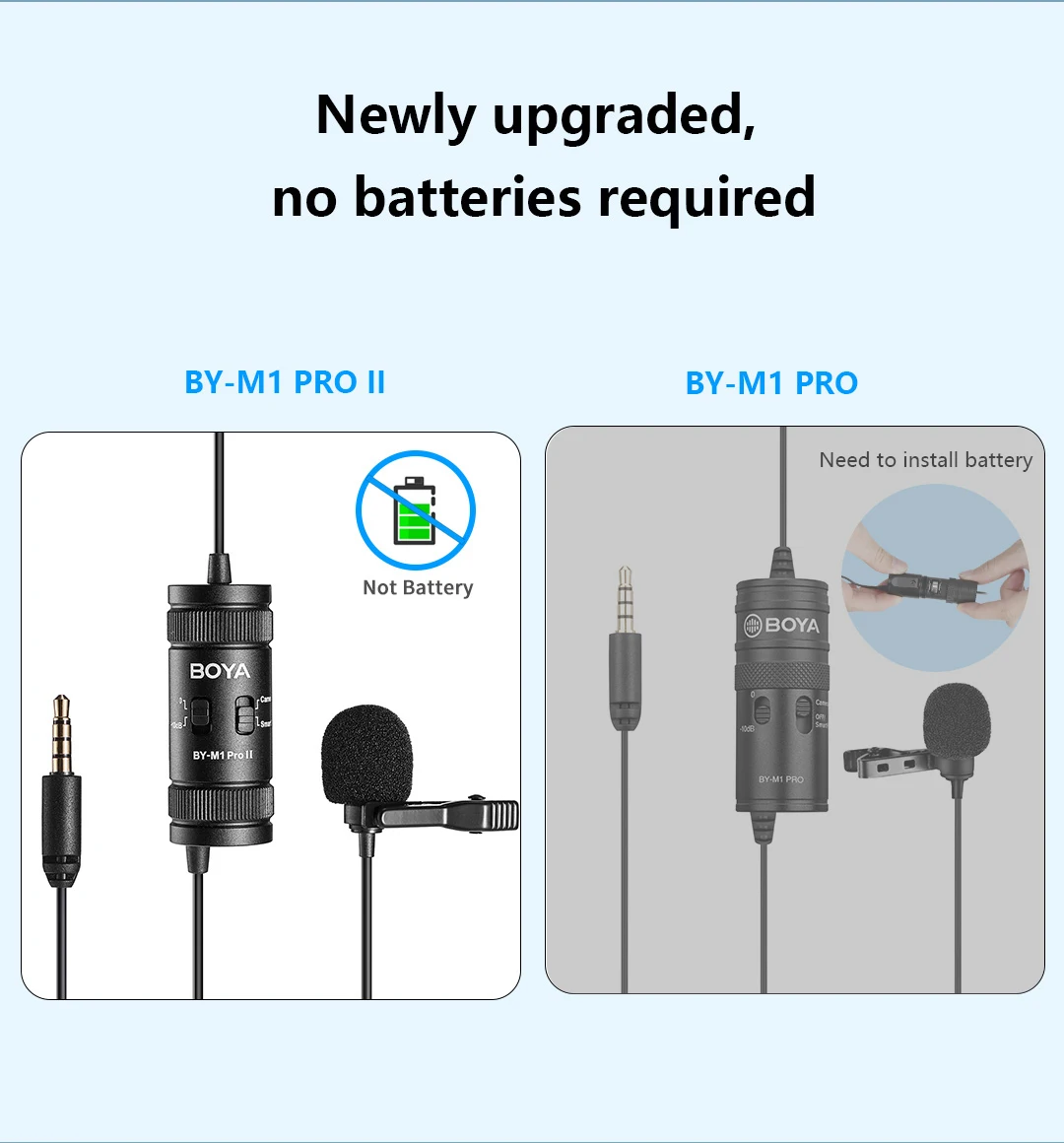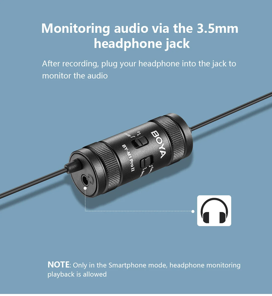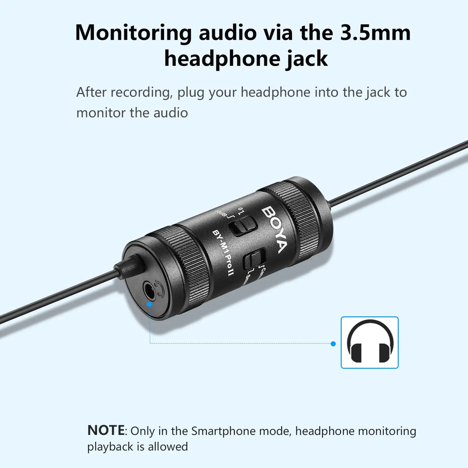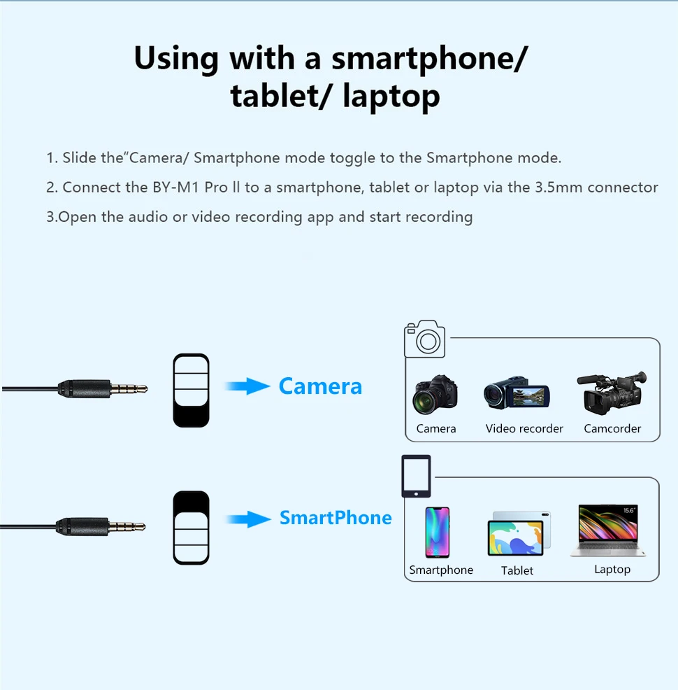 BY-M1 Pro Il — универсальный петличный микрофон с всенаправленной микрофонной капсулой, обеспечивающий 360-градусный захват звука, совместимый со смартфонами, планшетами, ПК, камерами, диктофонами и т. д. BY-M1 Pro ll имеет аудиокабель длиной 6 м (19,7 фута), что увеличивает пространство для движения и удобство использования. Благодаря настройке усиления микрофона -10 дБ он быстро понижает уровень, когда звук объекта съемки очень громкий и находится близко к микрофону, обеспечивая всегда четкую запись. Благодаря разъему для наушников 3,5 мм в нижней части пользователи могут контролировать звук в режиме смартфона. Он подходит для интервью, прямых трансляций, выступлений и многого другого.